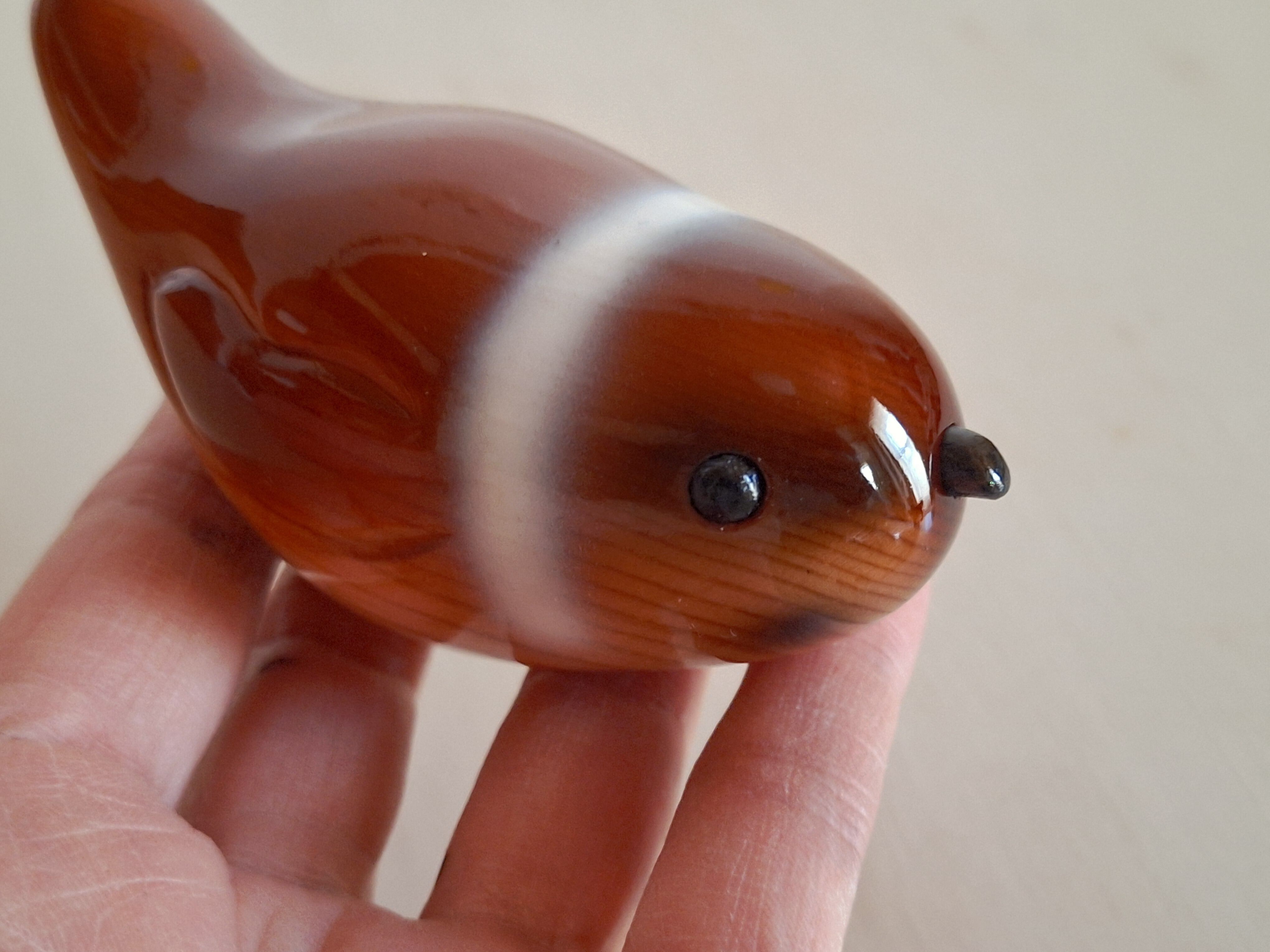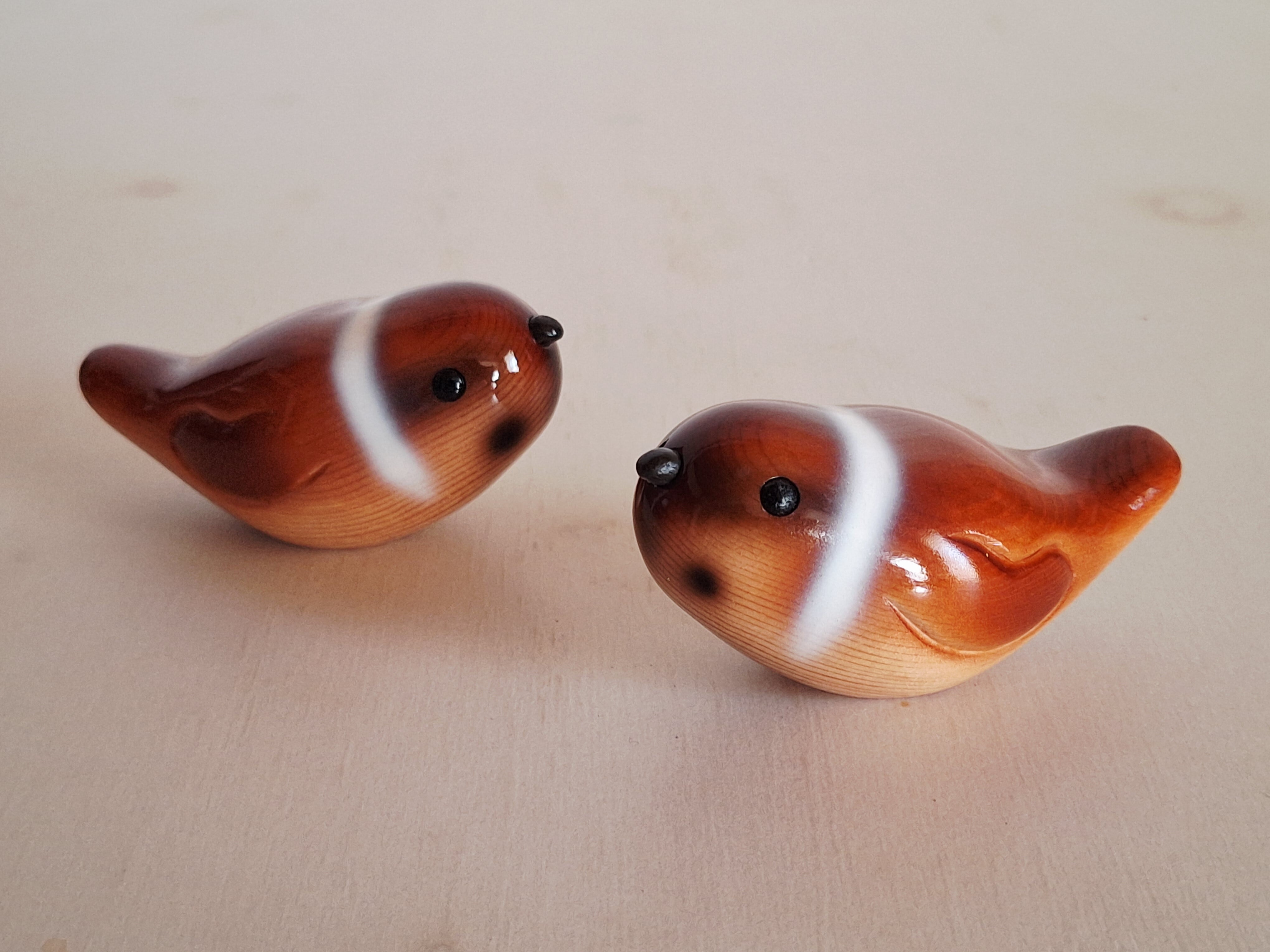 随分と前ですがアメリカの友人の家に訪れたとき、骨董商である彼の奥さまから金属でできたカニの置物を譲って頂きました(こちらは私の趣味の部屋、蔵の二階でご覧いただけます)。このカニを見て感銘を受けた娘がカニとスズメの童話を作りました。その童話に出てくるスズメをモデルに制作したのがこの作品です。