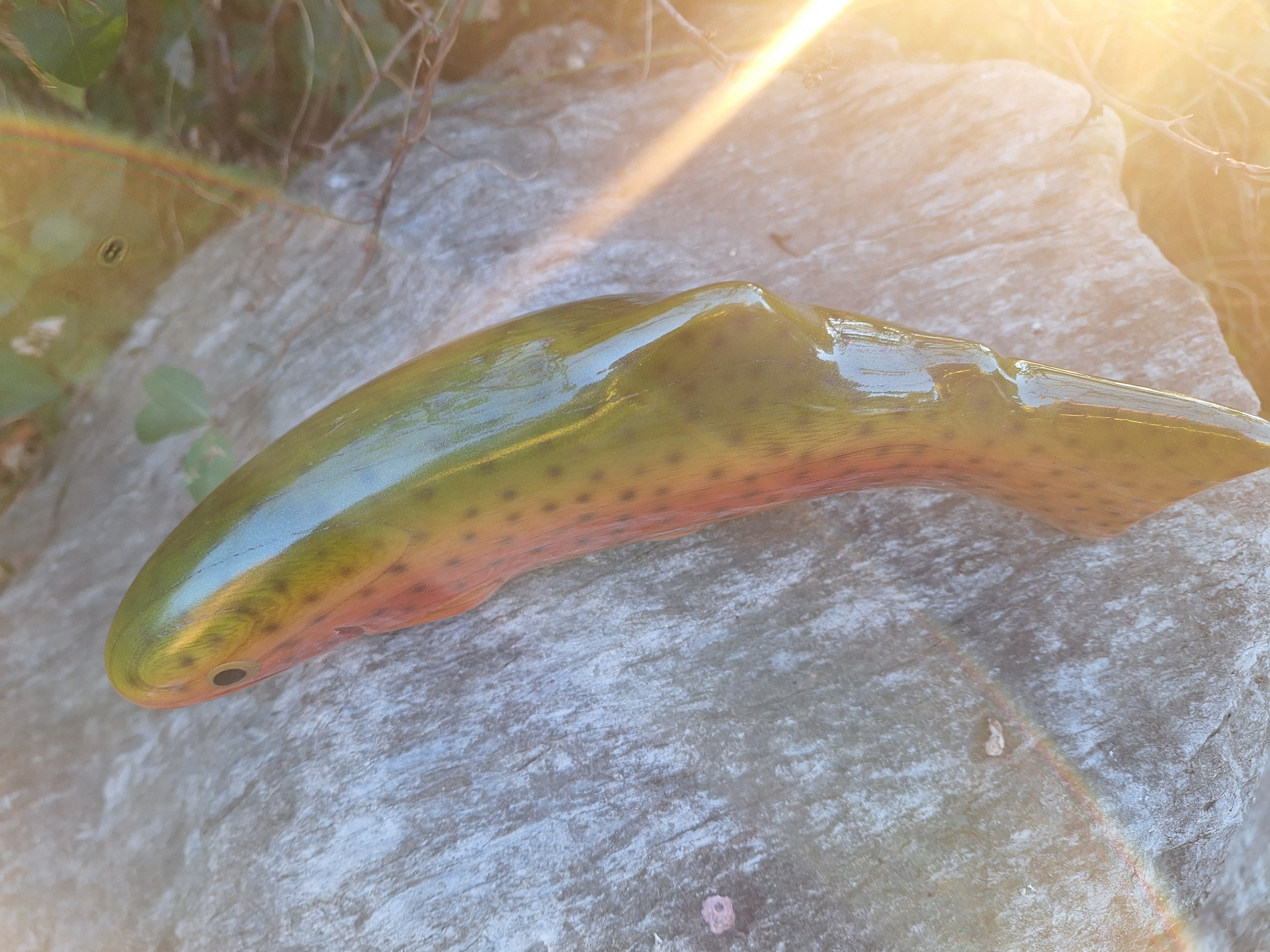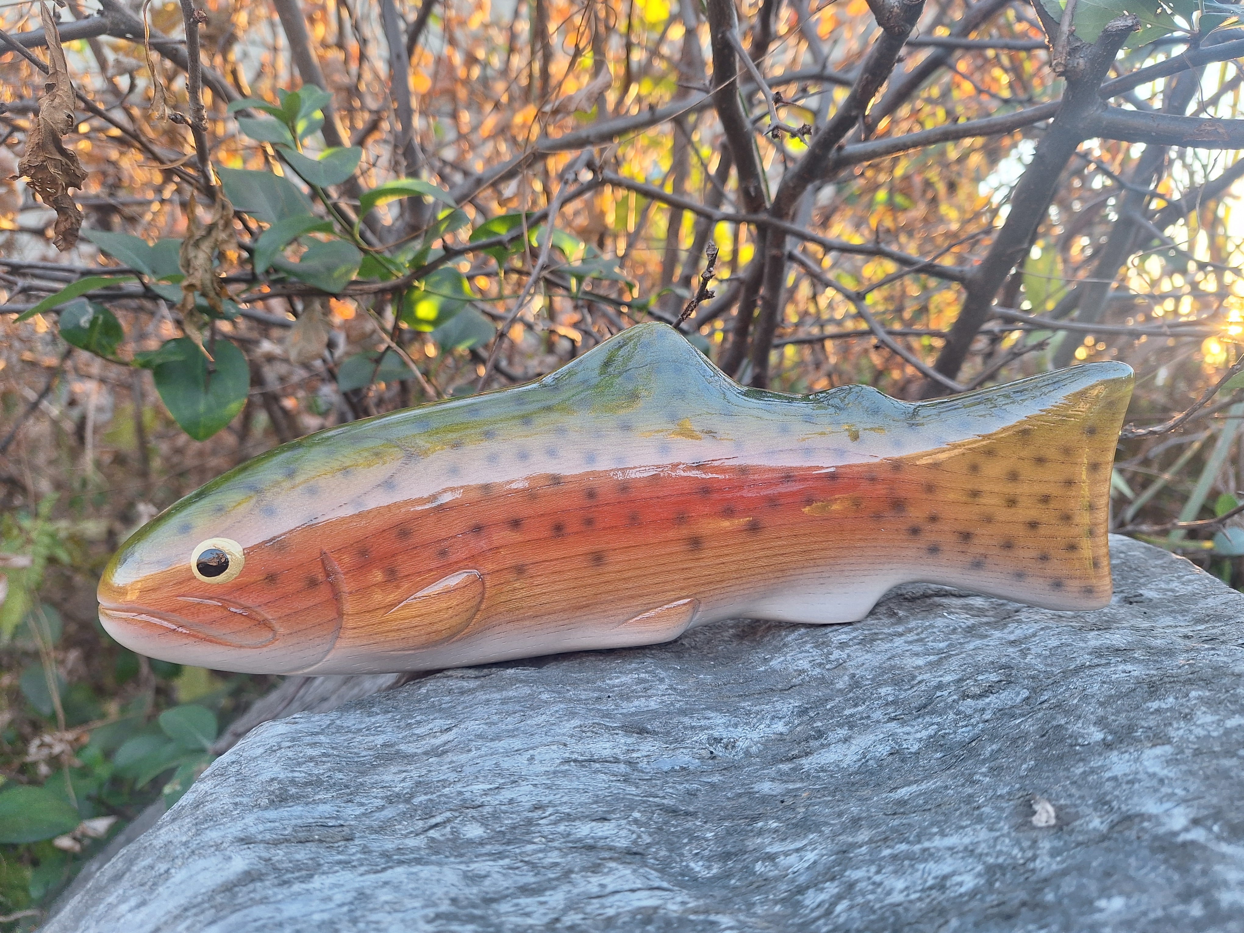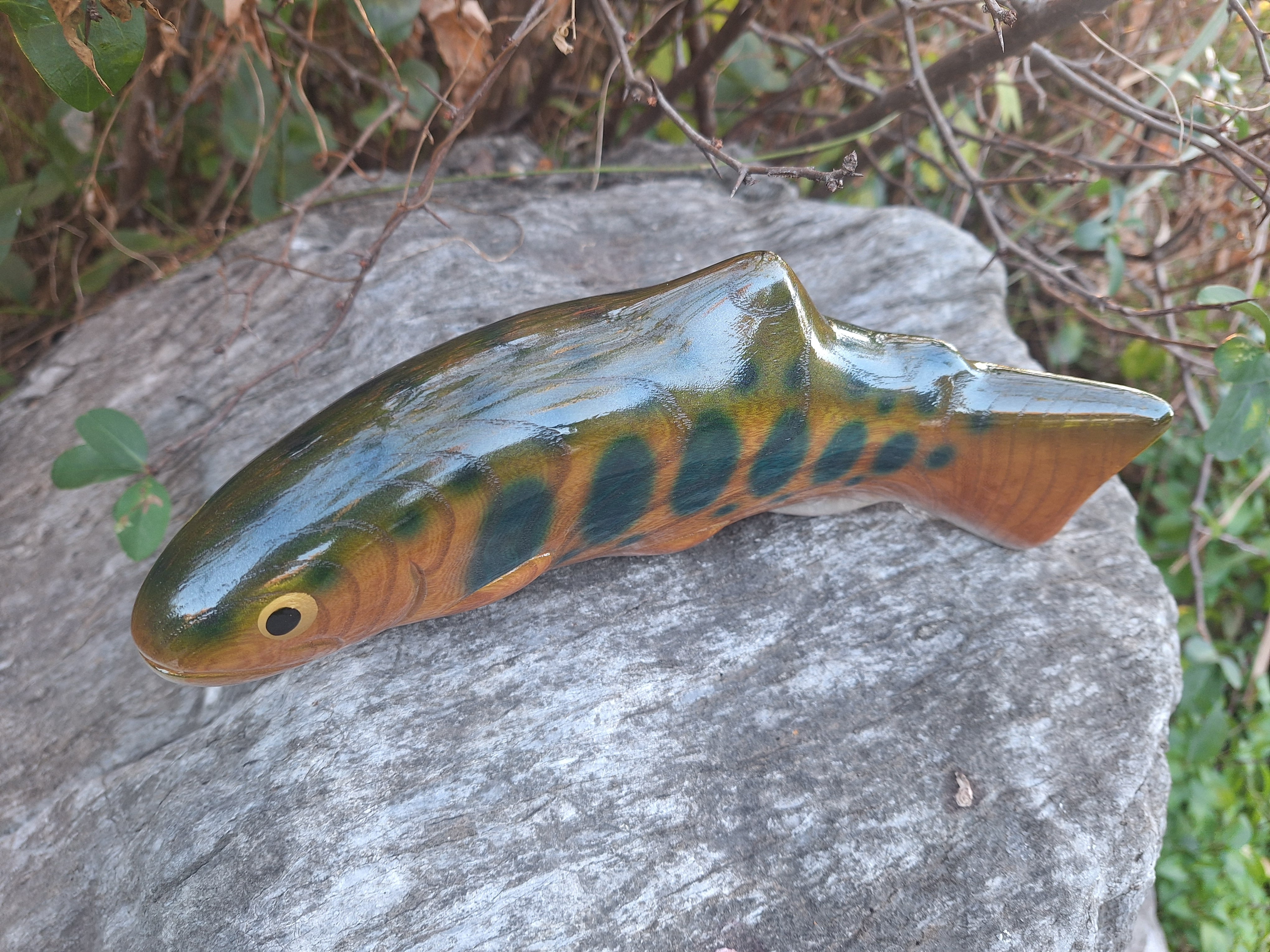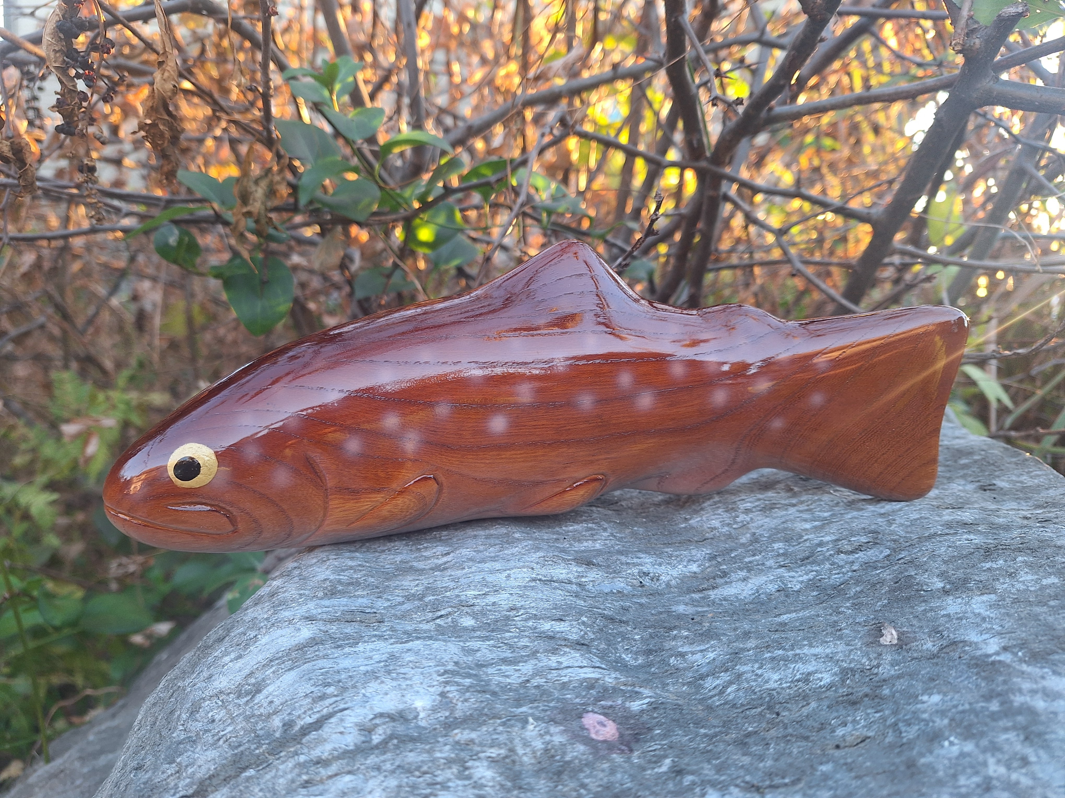 ニジマスをゆったりとしたカーブを活かした造形に仕上げました。 色合いも透き通りケヤキの木目に雄大な自然を感じます。