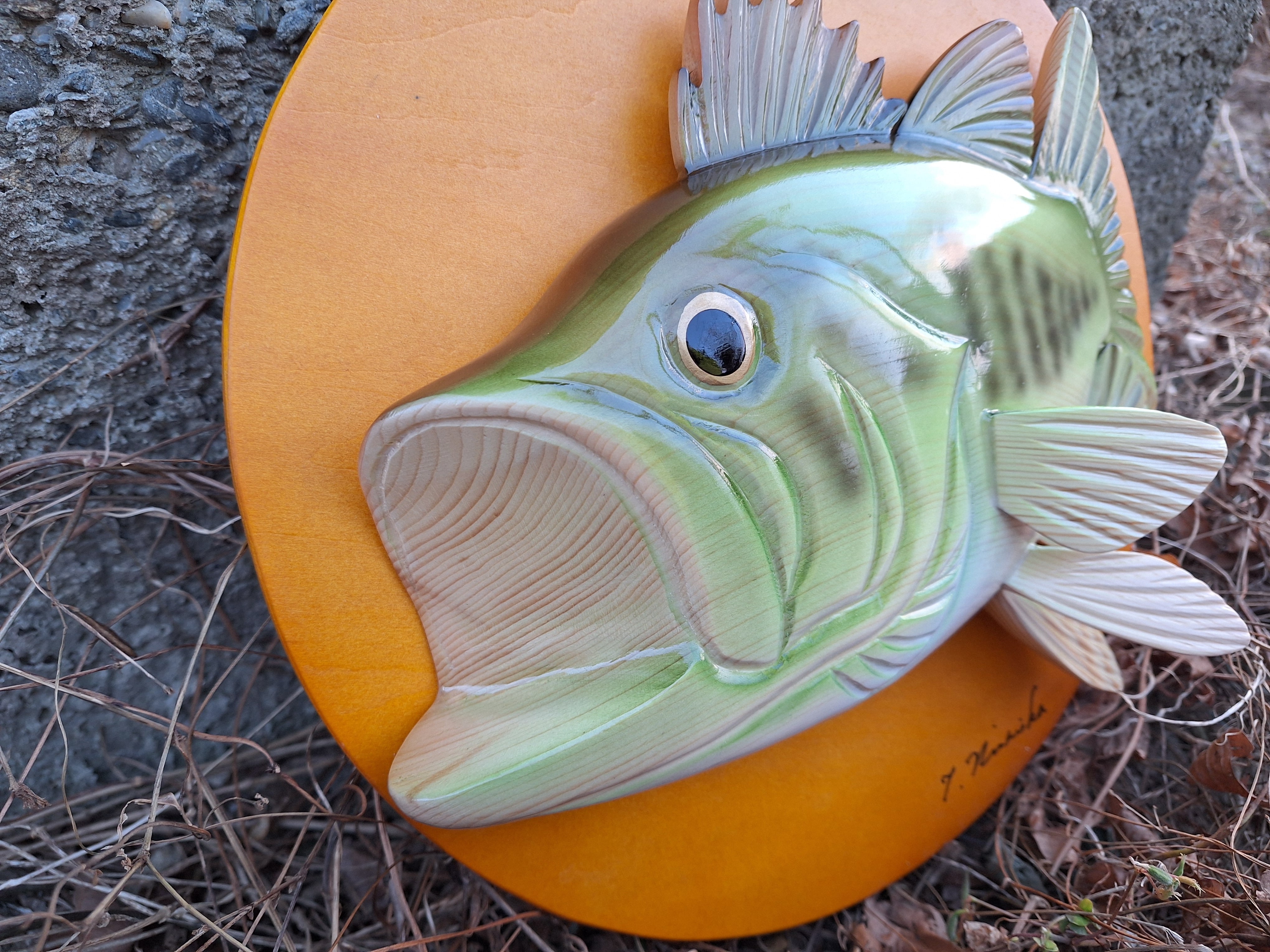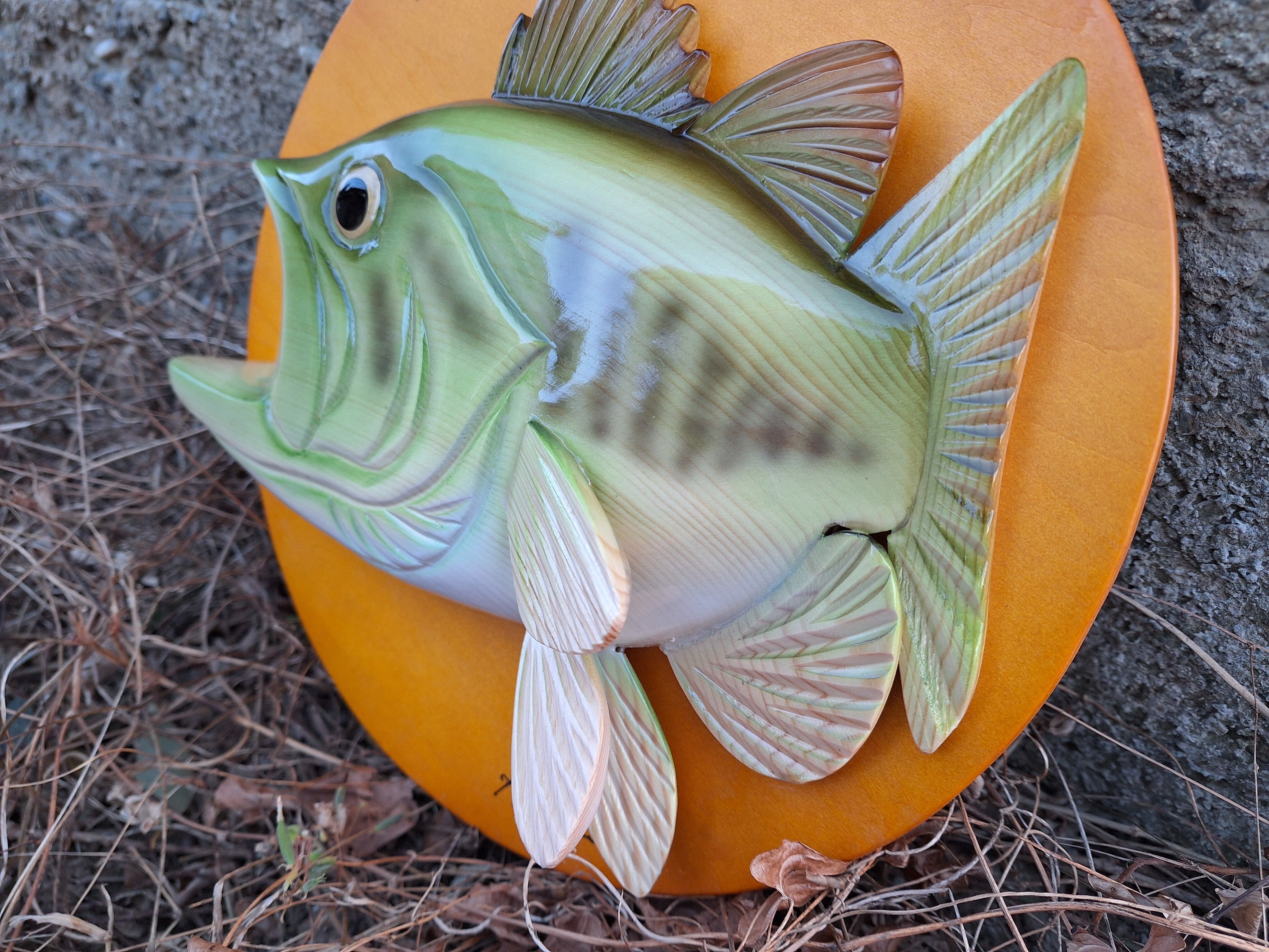 バスの壁掛けです。水面への光の加減によってブロンズに輝くように見えることからブロンズ・バックと呼ばれるバスを表現しました。