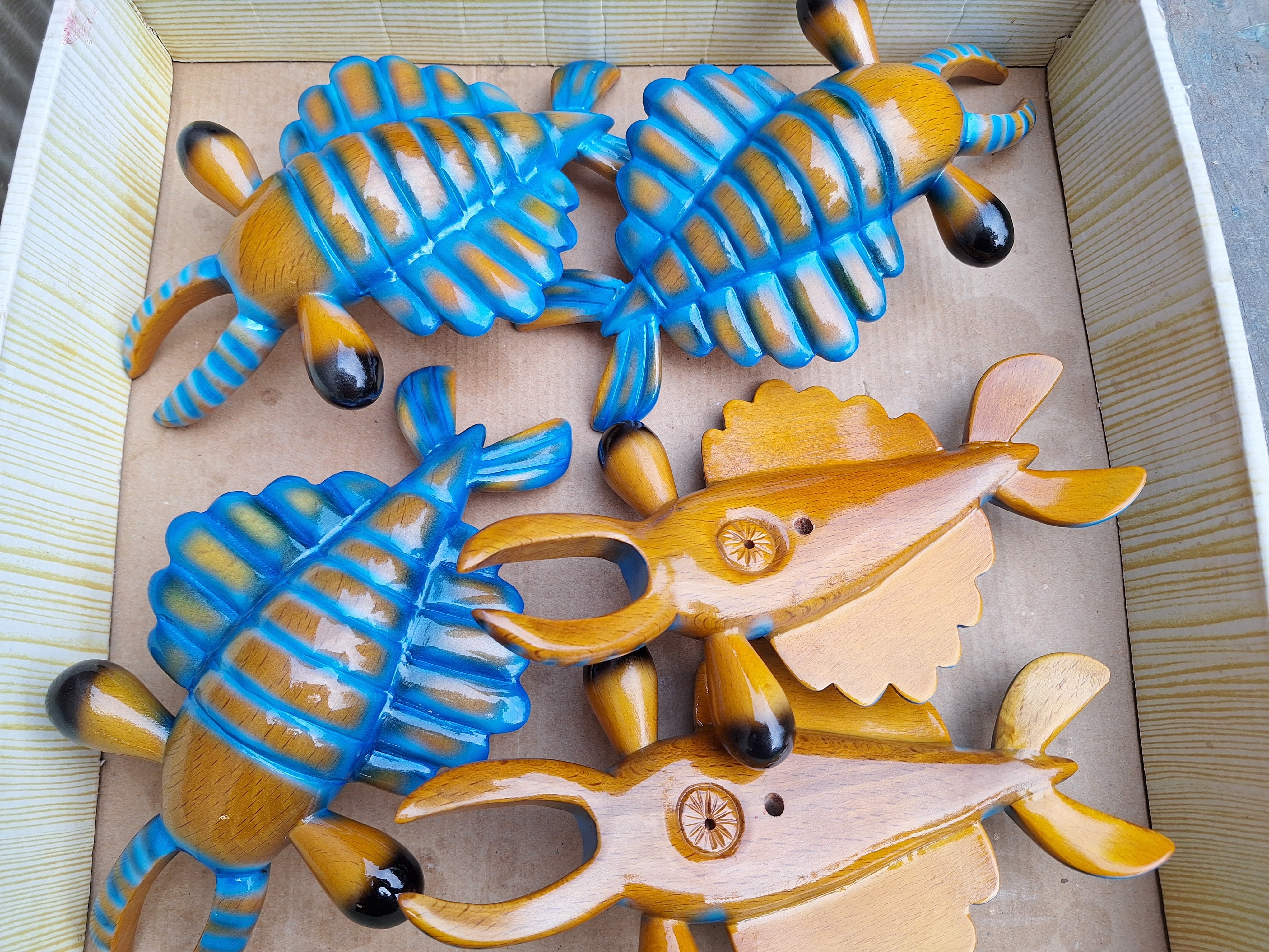 古生代カンブリア紀の海に生息していた節足動物で最大級だと知られています。名前の由来は『奇妙なエビ』。目は複眼で、頭から延びる前足で捕食していたと考えられています。これらをイメージしてデザインしました。